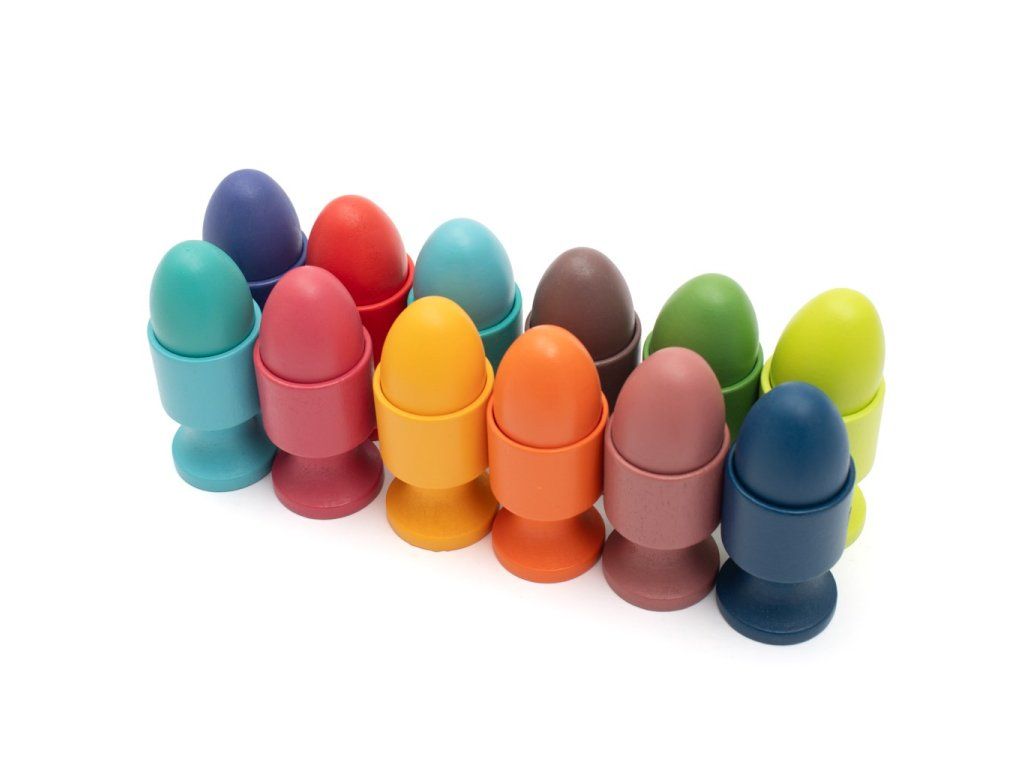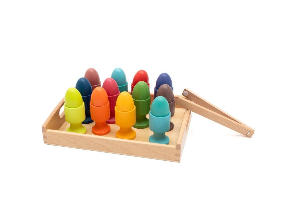 Tato barevná dřevěná sada obsahuje vajíčka a stojánky v různých barvách, které podporují rozvoj jemné motoriky, koordinaci ruky a oka a poznávání barev.